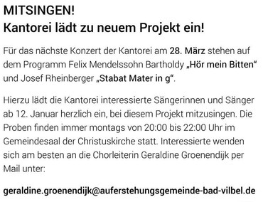 Kantorei: Einladung für neues Projekt