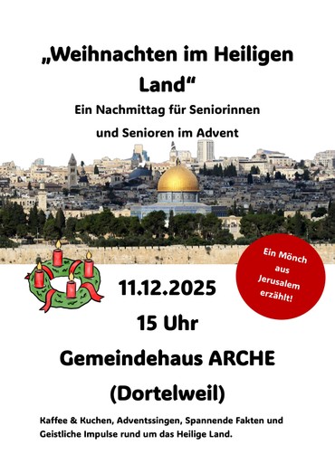 Unter diesem Motto steht dieser Nachmittag, der spannenden Einblicke zu biblischen Orte und dem Leben der Christen im Heiligen Land bietet. Es wird auch ein gemeinsames Adventsliedersingen sowie Kaffee & Kuchen geben.