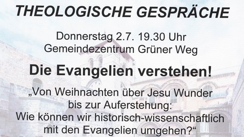 Theologischer Gesprächsabend begleitend zur Sommer-Predigtreihe über Jesustexte: "Die Evangelien verstehen: Von Weihnachten über Jesu Wunder bis zur Auferstehung: Wie können wir historisch-wissenschaftlich mit den Evangelien umgehen?" - Leitung Pfarrer Dr. Klaus Neumeier, keine Kosten oder Anmeldung